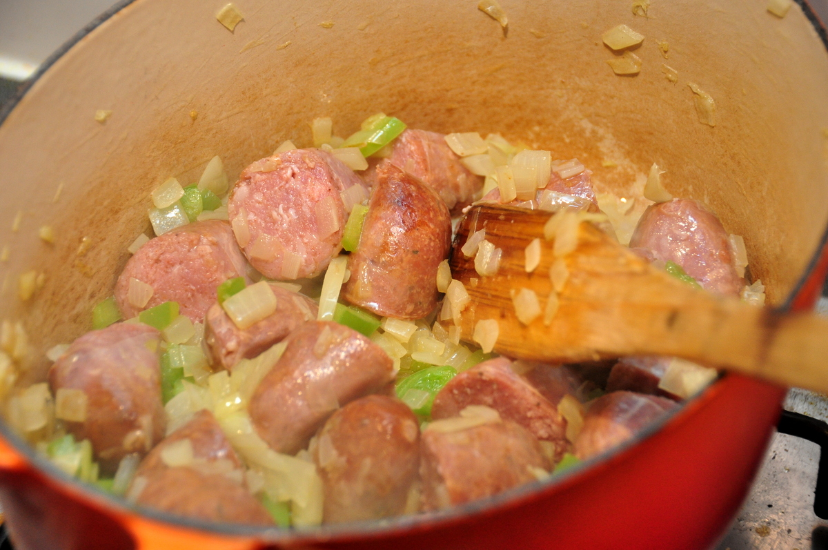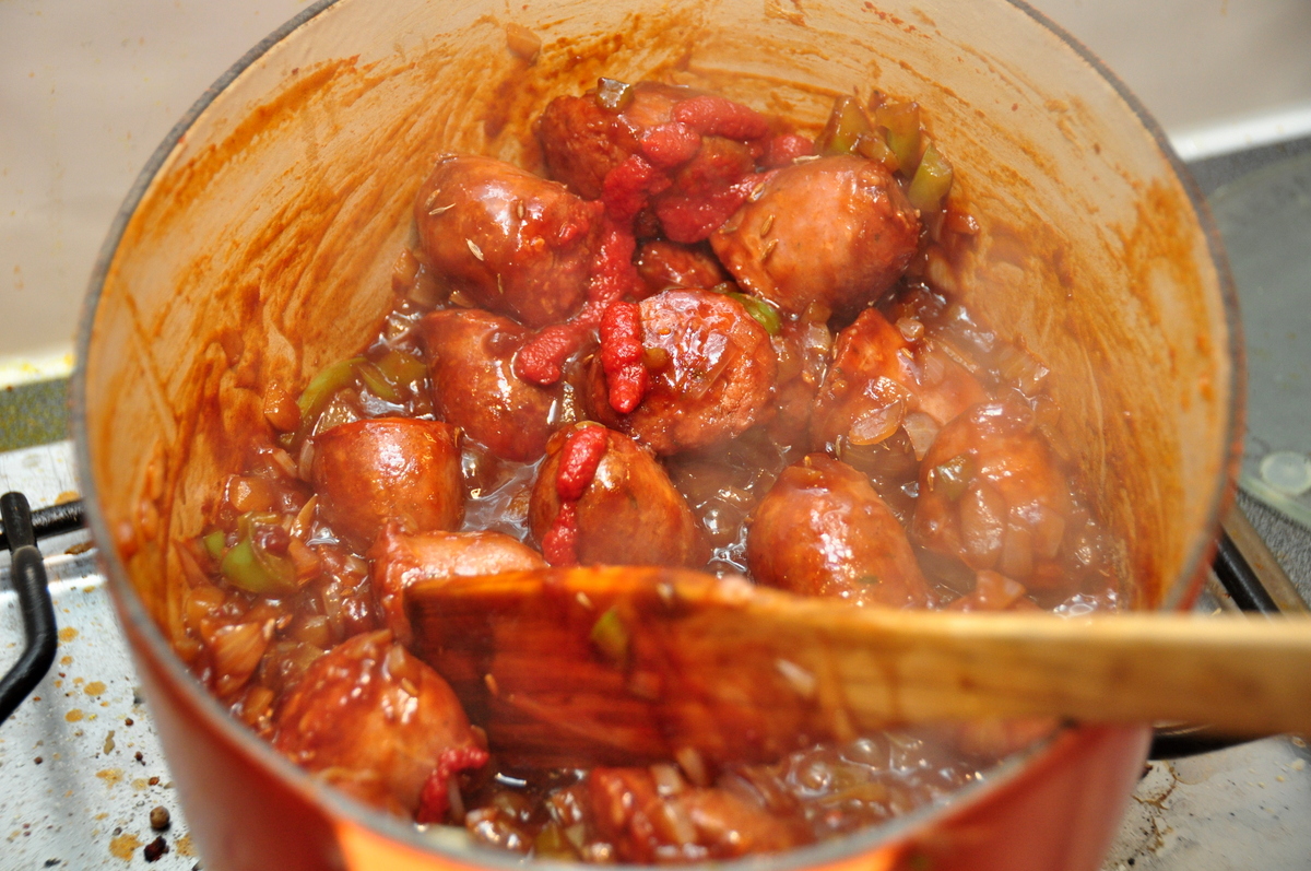 So my killer, secret ingredient here is Lap’s smoked andouille links … and it’s only a secret because he won’t tell me the recipe! I got some chipotle ketchup from Man-food.co.uk and bunged in a load for heat.
